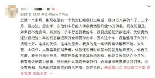 随着汽车保有量的增长,二手车市场越来越火爆,但这里面的水却非常深,入坑防不胜防。 陈先生在优信二手车平台花13万元买了一辆2011年的帕萨特,结果开了没多久就发现是事故车,车辆进过水,变速箱离合器也有问题,需要更换。“现在修车已经花了两万多,车基本上是开一天修两天。” ![]() 从6月7日开始,陈先生在微博上连续发布了24条博文讲诉自己的经历,并@优信官微。不过,截至发稿,优信官微没有对陈先生的微博进行回应。陈先生称,给客服打了将近1个月电话,都说已经向上面反映,会给出解决方案,但是没有一个人给他回复过电话。 不是个例 值得一提的是,陈先生的遭遇并不是个例,搜索微博、贴吧等社交网络,会发现消费者在二手车平台买到问题车、车辆无法过户、押金服务费拒不退还等吐槽比比皆是。百度输入“二手车 事故车”关键词,相关搜索结果有1160万个。